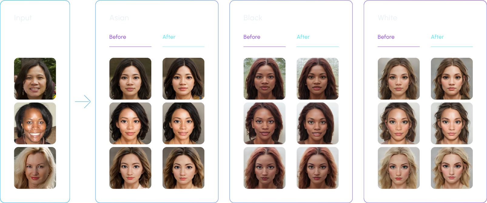 자체 데이터셋을 사용하여 학습된 모델에서는 결과물 이미지의 퀄리티가 일정하게 유지되고, 투입 이미지와 비교했을 때 성별/인종 정체성 면에서 통계적으로 유의미한 차이를 보이지 않았습니다. 또한 해당 지표들에 대한 평가자 편향을 최소화하기 위해 여러 평가자들의 결과에 대해 표준화 작업(normalisation)을 거쳤습니다. 본 연구는 편향된 데이터셋 문제를 해결하는 새로운 접근법을 제시하였으며, 보다 공정한 AI 모델을 통해 다양한 배경의 사람들이 가진 인종/성별 스펙트럼을 자유롭게 표현할 수 있도록 한다는 점에 그 의의가 있습니다.
